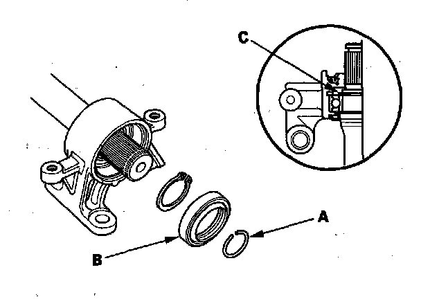2. Remove the set ring (A), the outer seal (B), and the external snap ring (C).