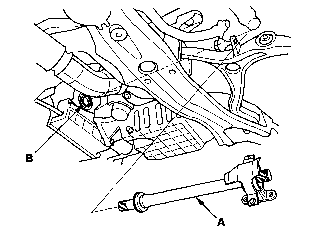 4. Remove the intermediate shaft (A) from the differential. Hold the intermediate shaft horizontal until it is clear of the differential to prevent damaging the differential oil seal (B).