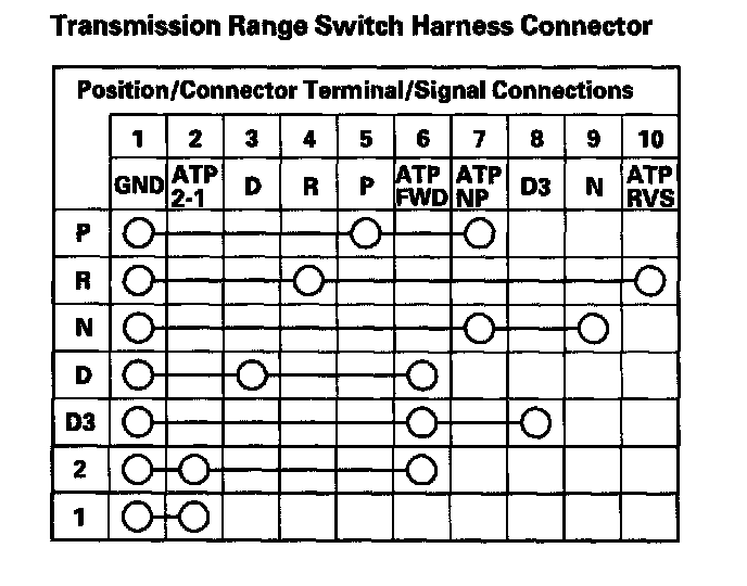 8. Check for continuity between the terminals at the transmission range switch connector. There should be continuity between the terminals in the following table for each transmission range switch position.