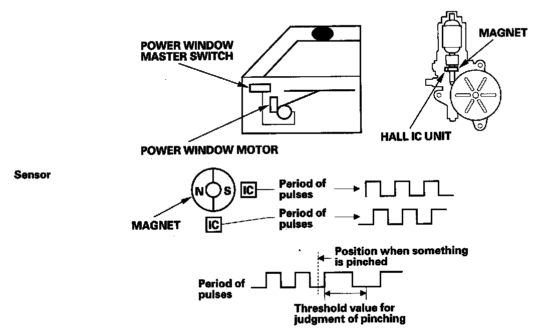 The power window motor incorporates a pulser which generates pulses during the motor's operation and sends pulses to the driver's and passenger's power window control unit. As soon as the power window control unit detects a change in the pulse frequency from the pulser, the power window control unit makes the power window motor stop and reverse. This prevents pinching your hand or fingers during auto-up operation.