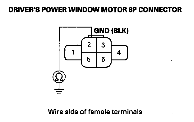 8. Check for continuity between the driver's power window motor 6P connector No. 2 terminal and body ground. There should be continuity.