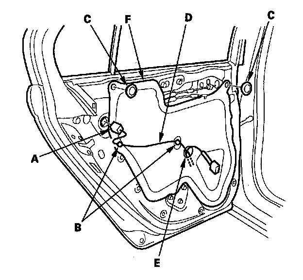 2. Disconnect the power door lock actuator connector (A), and detach the harness clips (B). Remove the plug caps (C).