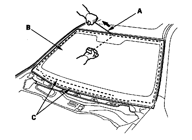 6. With a helper on the outside, pull the piano wire (A) back and forth in a sawing motion. Hold the piano wire as close to the windshield (B) as possible to prevent damage to the body and dashboard. Carefully cut through the rubber dam and adhesive (C) around the entire windshield.