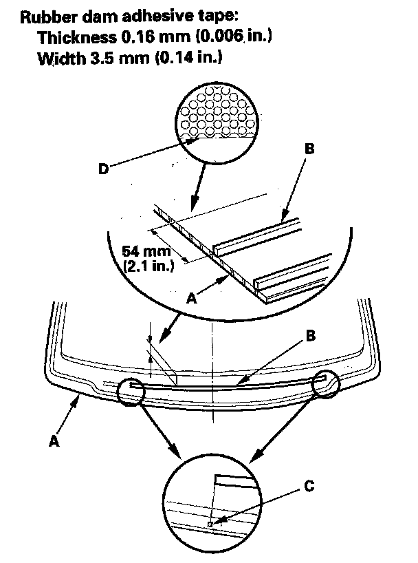 - With the edge (D) of the black ceramic on the windshield as a guide, attach the rubber dam B to the windshield.