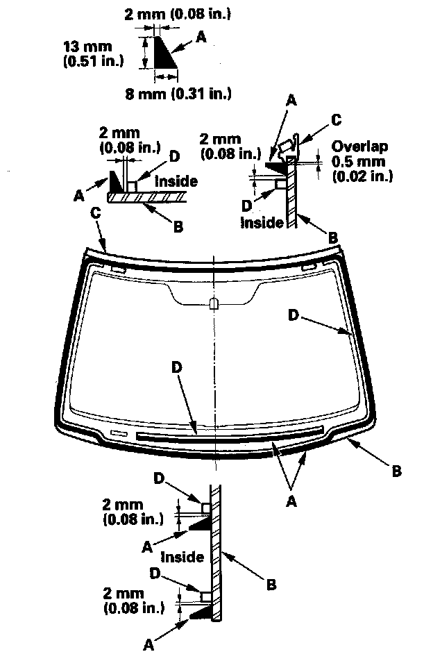 21. Pack adhesive into the cartridge without air pockets to ensure continuous delivery. Put the cartridge in a caulking gun, and run a bead of adhesive (A) to the windshield (B) along the edge of the molding (C) and rubber dams (D) as shown. Apply the adhesive within 30 minutes after applying the glass primer. Make a slightly thicker bead at each corner.