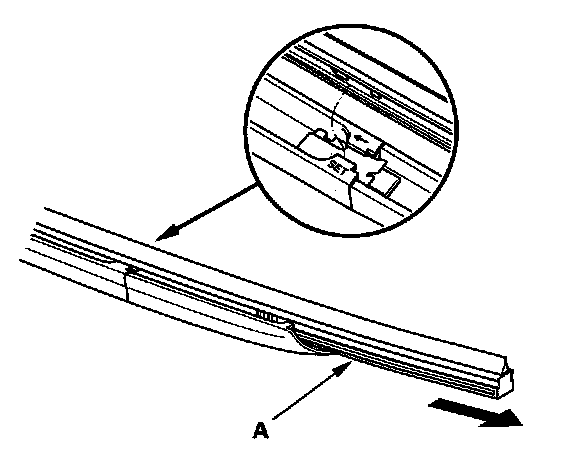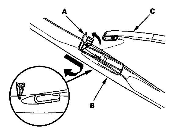 2. Pull up and hold the tab (A), and slide the wiper blade assembly (B) toward the tabs until it releases from the wiper arm (C).