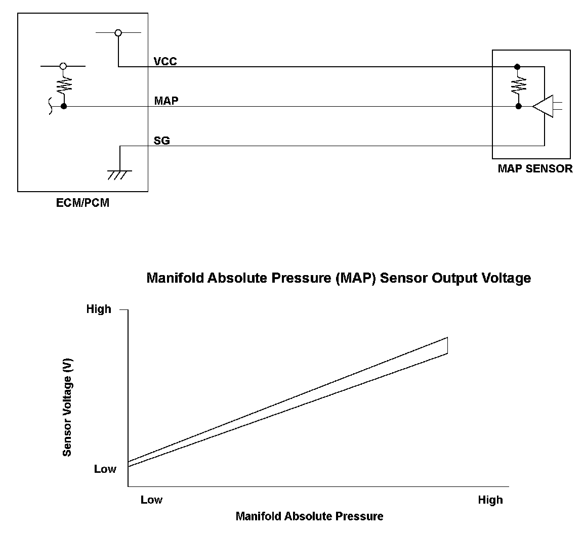 The manifold absolute pressure (MAP) sensor senses manifold absolute pressure (vacuum) and converts it into electrical signals. The MAP sensor outputs low signal voltage at high-vacuum (throttle valve closed) and high signal voltage at low-vacuum (throttle valve wide open). If a signal voltage from the MAP sensor is a set value or less, the engine control module (ECM)/powertrain control module (PCM) detects a malfunction and a DTC is stored.
