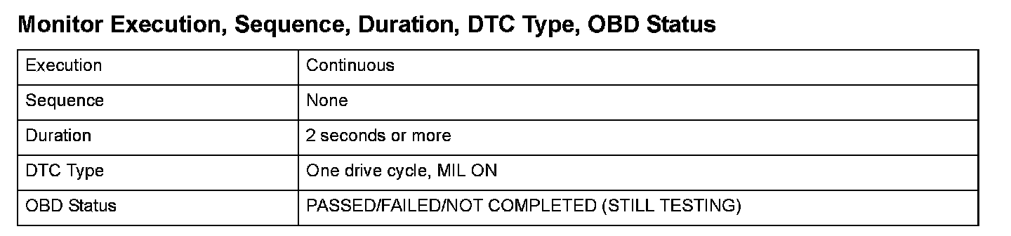 Monitor Execution, Sequence, Duration, DTC Type, OBD Status