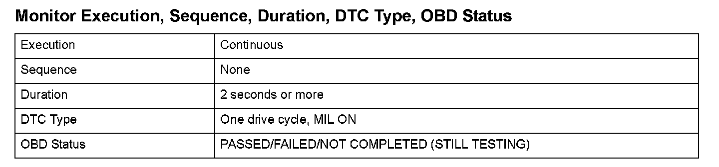 Monitor Execution, Sequence, Duration, DTC Type, OBD Status