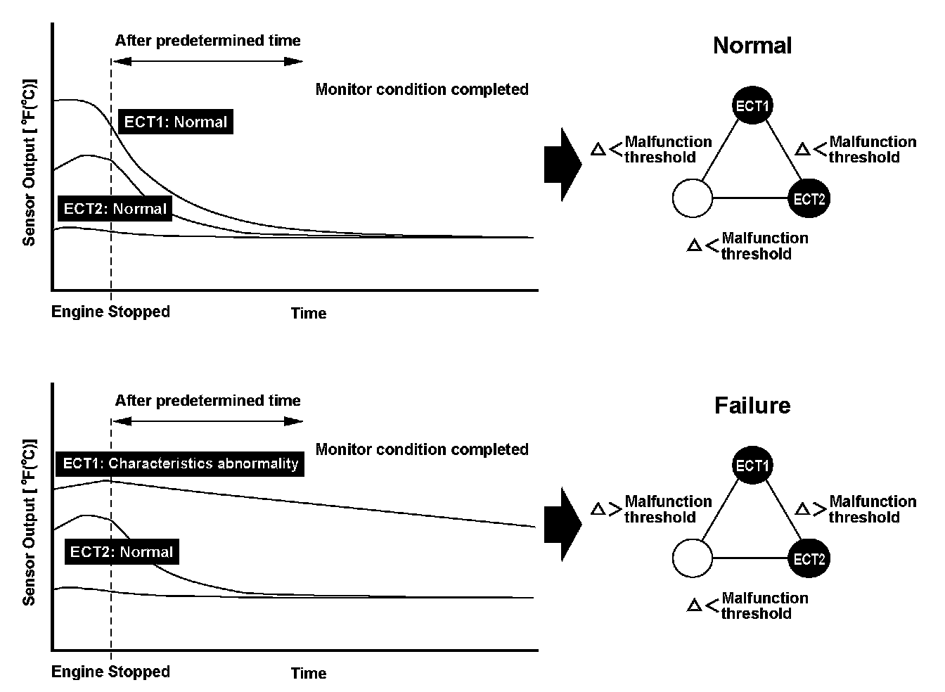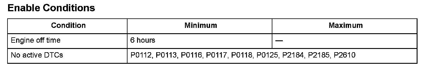 Two engine coolant temperature sensors and one intake air temperature sensor are used by the engine control module (ECM)/powertrain control module (PCM). When the engine is stopped and enough time has passed, the temperature of the engine will equalize to the ambient temperature. When an inappropriate temperature is detected after comparing the temperature readings of each sensor, a malfunction in the corresponding sensor is detected and a DTC is stored.