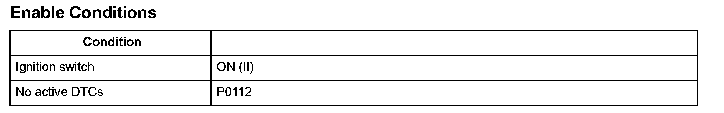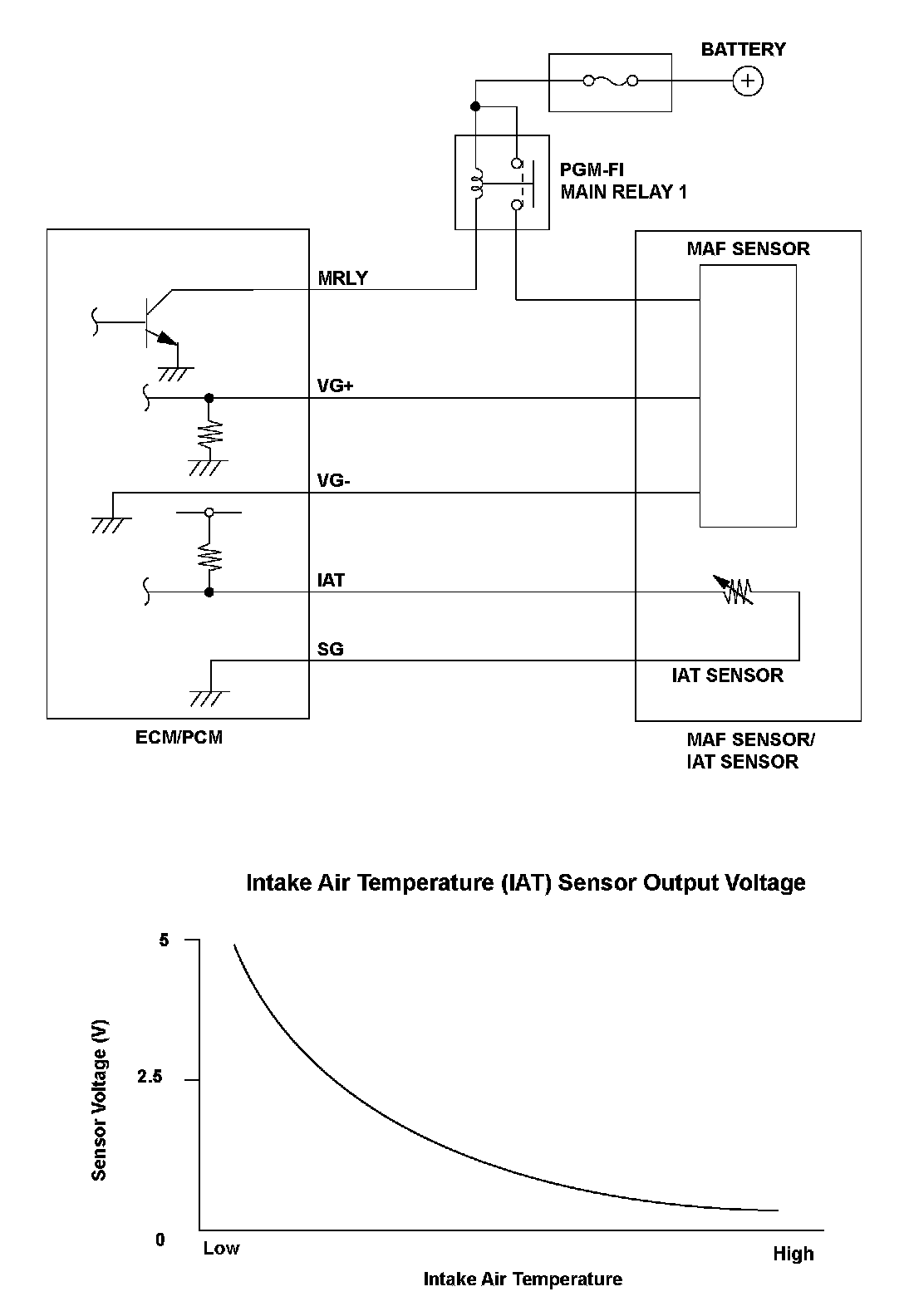 The intake air temperature (IAT) sensor is a thermistor that detects intake air temperature, and it is used for A/F feedback control to compensate for the atmospheric density fluctuations that accompany changes in intake air temperature. The IAT sensor resistance varies depending on temperature. The output voltage and the sensor resistance increase as the intake air temperature decreases. Conversely, the output voltage and the sensor resistance decrease as the intake air temperature increases. If the IAT sensor output voltage is excessively high, the engine control module (ECM)/powertrain control module (PCM) detects a malfunction and a DTC is stored.