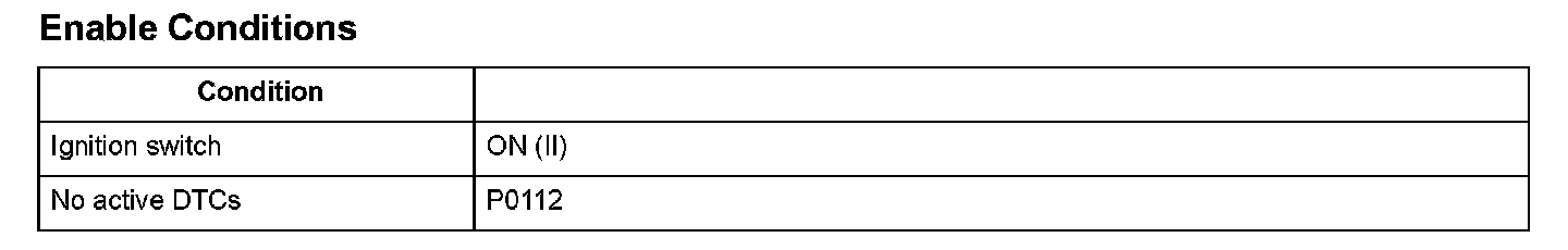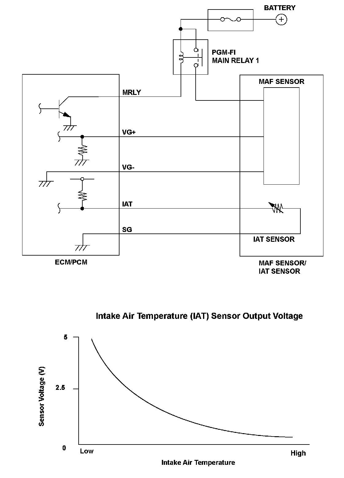 The intake air temperature (IAT) sensor is a thermistor that detects intake air temperature, and it is used for A/F feedback control to compensate for the atmospheric density fluctuations that accompany changes in intake air temperature. The IAT sensor resistance varies depending on temperature. The output voltage and the sensor resistance increase as the intake air temperature decreases. Conversely, the output voltage and the sensor resistance decrease as the intake air temperature increases. If the IAT sensor output voltage is excessively high, the engine control module (ECM)/powertrain control module (PCM) detects a malfunction and a DTC is stored.