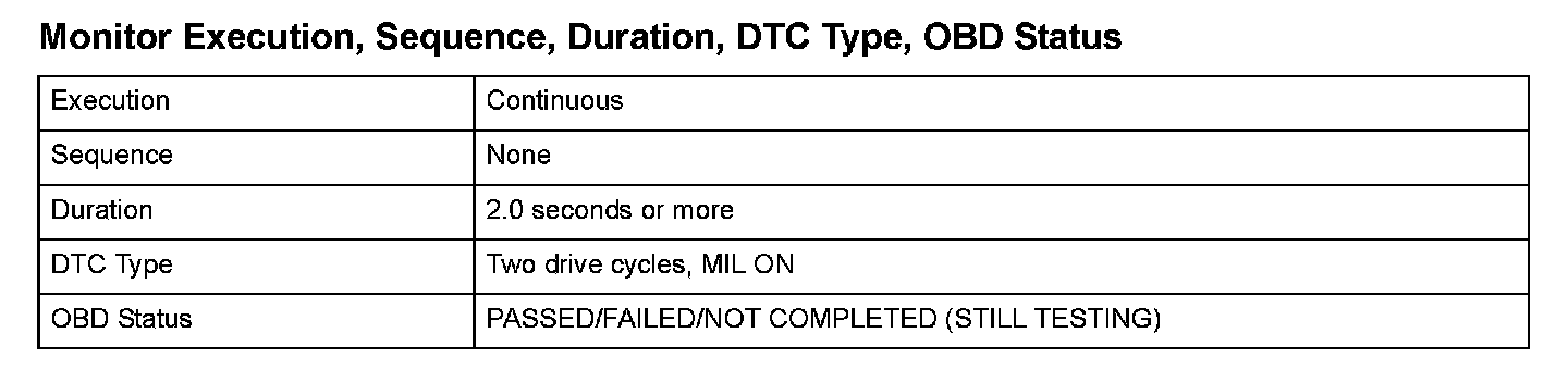 Monitor Execution, Sequence, Duration, DTC Type, OBD Status
