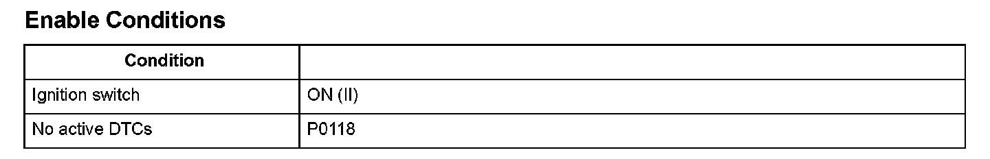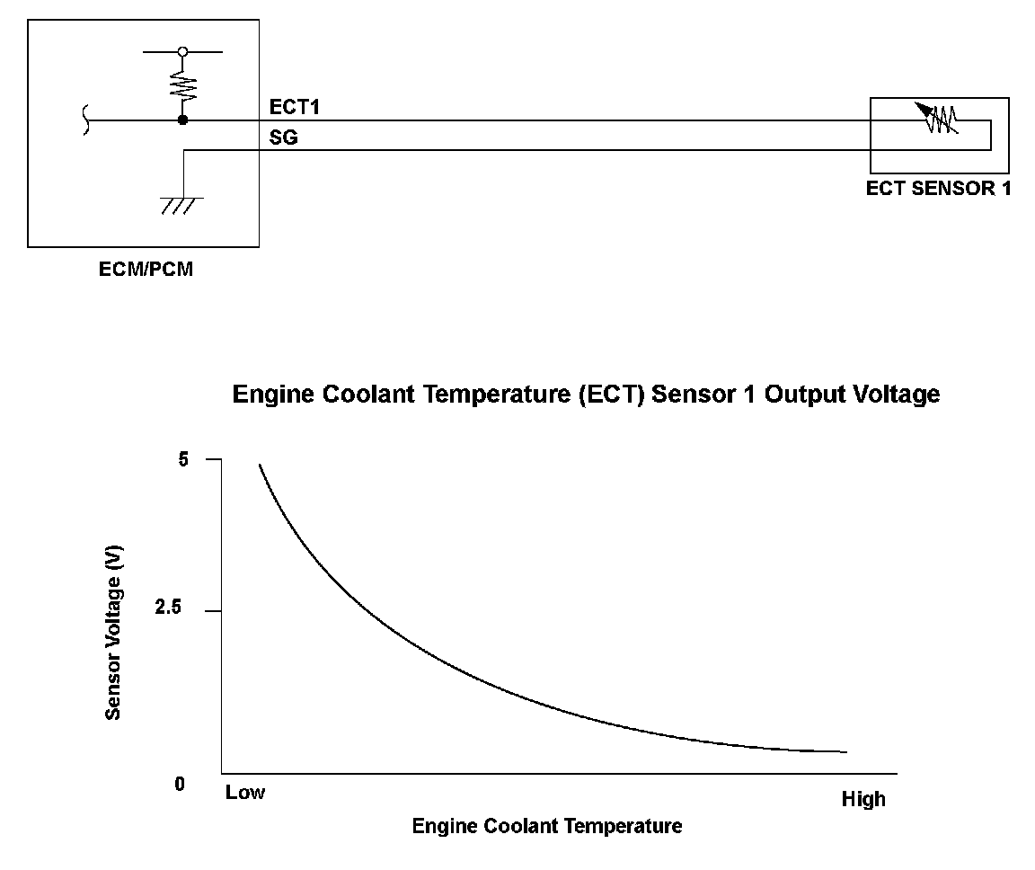Engine coolant temperature (ECT) sensor 1 is used for air/fuel ratio feedback control, ignition timing control, idle speed control, and other functions. The ECT sensor 1 resistance varies depending on the engine coolant temperature. As the engine coolant cools, the ECT sensor 1 resistance increases, and the engine control module (ECM)/powertrain control module (PCM) detects a high signal voltage. As the engine coolant warms, the ECT sensor 1 resistance decreases, and the ECM/PCM detects a low signal voltage. If the ECT sensor 1 output voltage is a set value or less when the engine coolant temperature is high, the ECM/PCM detects a malfunction and a DTC is stored.