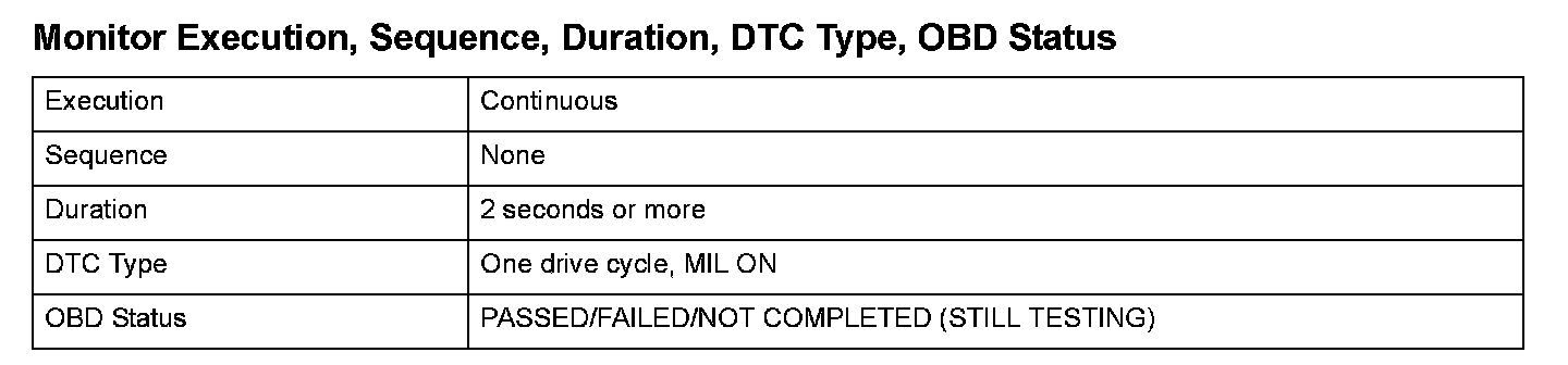Monitor Execution, Sequence, Duration, DTC Type, OBD Status