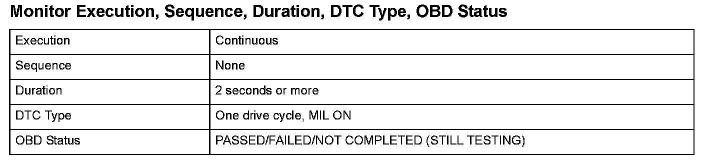Monitor Execution, Sequence, Duration, DTC Type, OBD Status