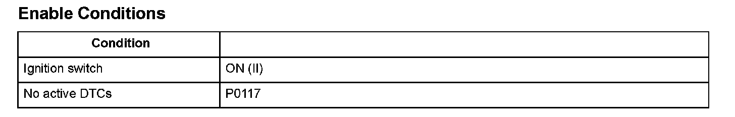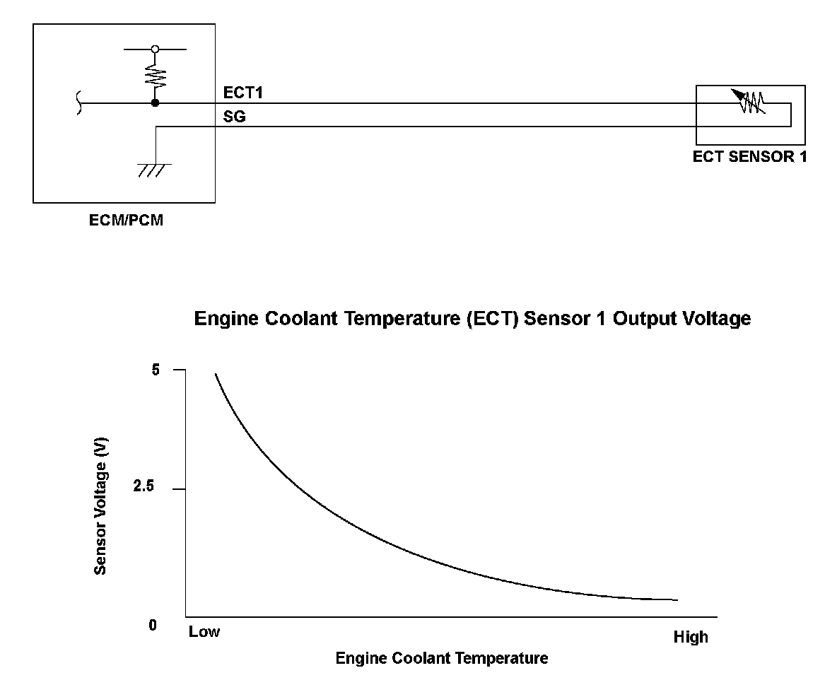 Engine coolant temperature (ECT) sensor 1 is used for air/fuel ratio feedback control, ignition timing control, idle speed control, and other functions. The ECT sensor 1 resistance varies depending on the engine coolant temperature. As the engine coolant cools, the ECT sensor 1 resistance increases, and the engine control module (ECM)/powertrain control module (PCM) detects a high signal voltage. As the engine coolant warms, the ECT sensor 1 resistance decreases, and the ECM/PCM detects a low signal voltage. If the ECT sensor 1 output voltage is more than a set value when the engine coolant temperature is low, the ECM/PCM detects a malfunction and a DTC is stored.