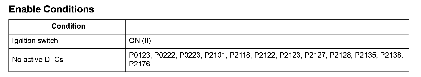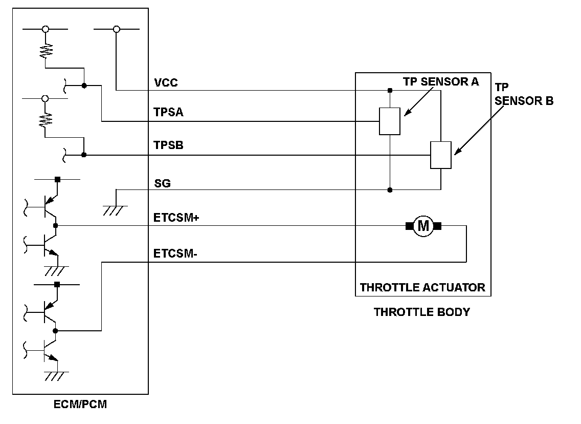 Throttle position (TP) sensor A is a semiconductor type, and it is attached to the throttle body and shaft to determine throttle valve position. The throttle valve position signal from TP sensor A is transmitted to the engine control module (ECM)/powertrain control module (PCM) for target position feedback control. If the signal from TP sensor A is less than a fixed value for a set time, the ECM/PCM detects a TP sensor A malfunction and stores a DTC.