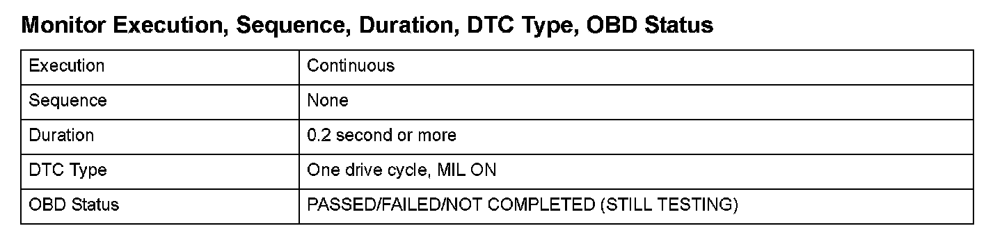Monitor Execution, Sequence, Duration, DTC Type, OBD Status