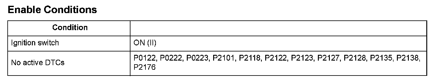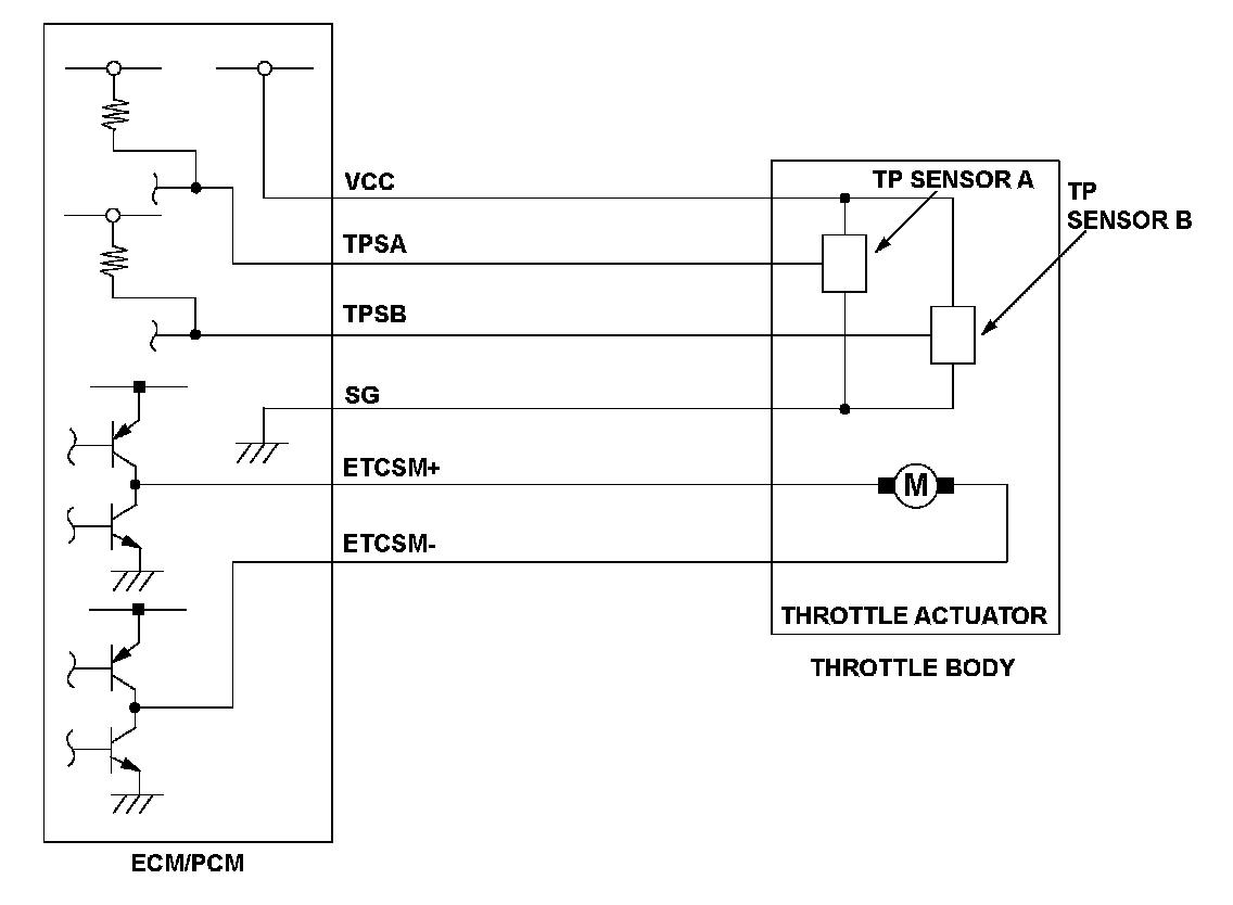 Throttle position (TP) sensor A is a semiconductor type, and it is attached to the throttle body and shaft to determine throttle valve position. The throttle valve position signal from TP sensor A is transmitted to the engine control module (ECM)/powertrain control module (PCM) for target position feedback control. If the signal from TP sensor A is more than a fixed value for a set time, the ECM/PCM detects a TP sensor A malfunction and stores a DTC.