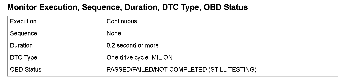 Monitor Execution, Sequence, Duration, DTC Type, OBD Status