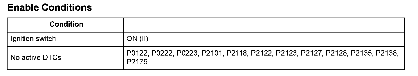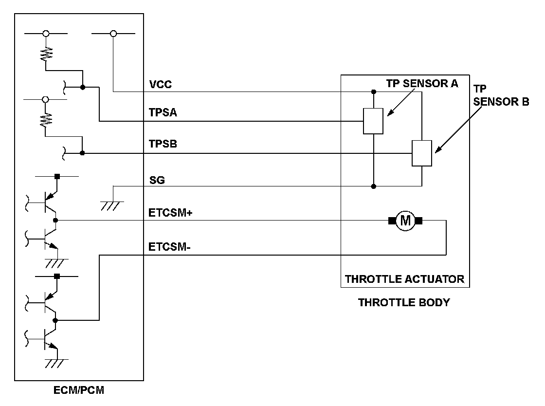 Throttle position (TP) sensor A is a semiconductor type, and it is attached to the throttle body and shaft to determine throttle valve position. The throttle valve position signal from TP sensor A is transmitted to the engine control module (ECM)/power-train control module (PCM) for target position feedback control. If the signal from TP sensor A is more than a fixed value for a set time, the ECM/PCM detects a TP sensor A malfunction and stores a DTC.