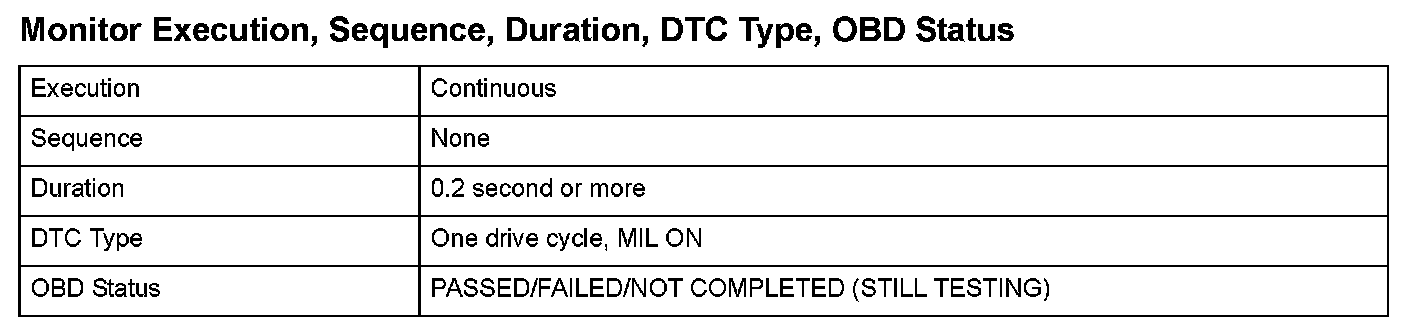 Monitor Execution, Sequence, Duration, DTC Type, OBD Status
