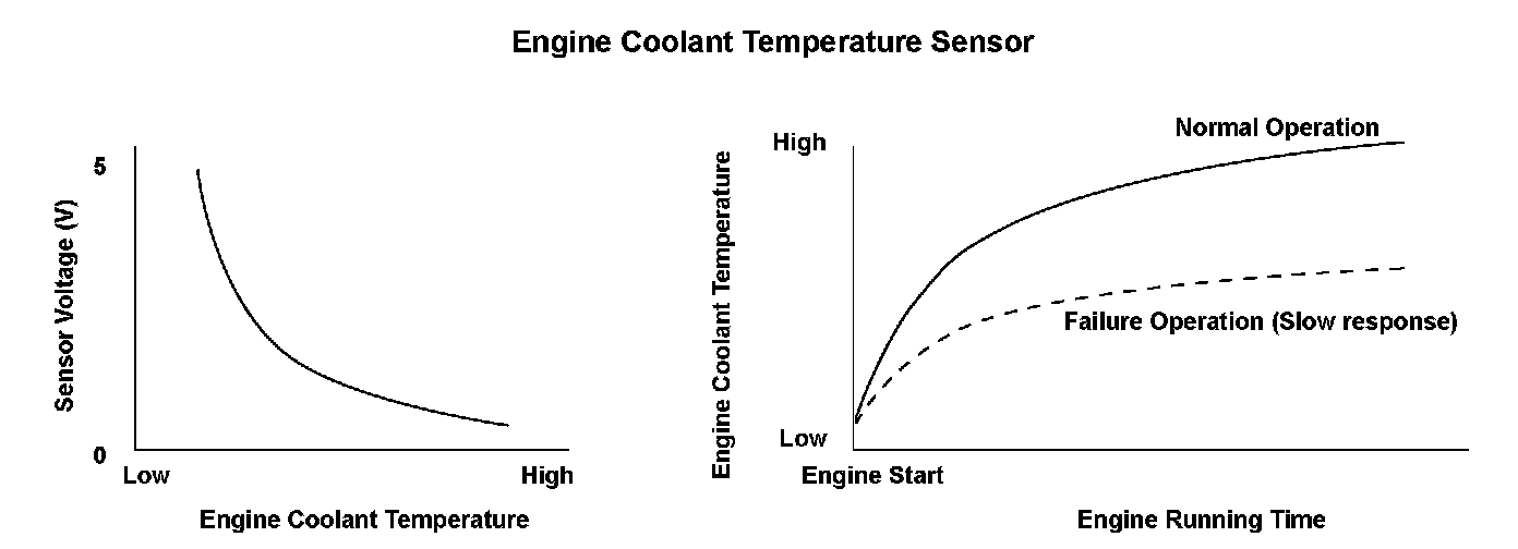The engine control module (ECM)/powertrain control module (PCM) supplies voltage to the engine coolant temperature (ECT) signal circuit (about 5 V) through a pull-up resistor. As the engine coolant cools, the ECT sensor 1 resistance increases, and the ECM/PCM detects a high signal voltage. As the engine coolant warms, the ECT sensor 1 resistance decreases, and the ECM/PCM detects a low signal voltage. If the ECT sensor 1 output voltage does not reach a specified temperature at which closed-loop control for stoichiometric air/fuel ratio starts within a set time, depending on the initial coolant temperature after starting the engine, the ECM/PCM detects a malfunction and a DTC is stored.