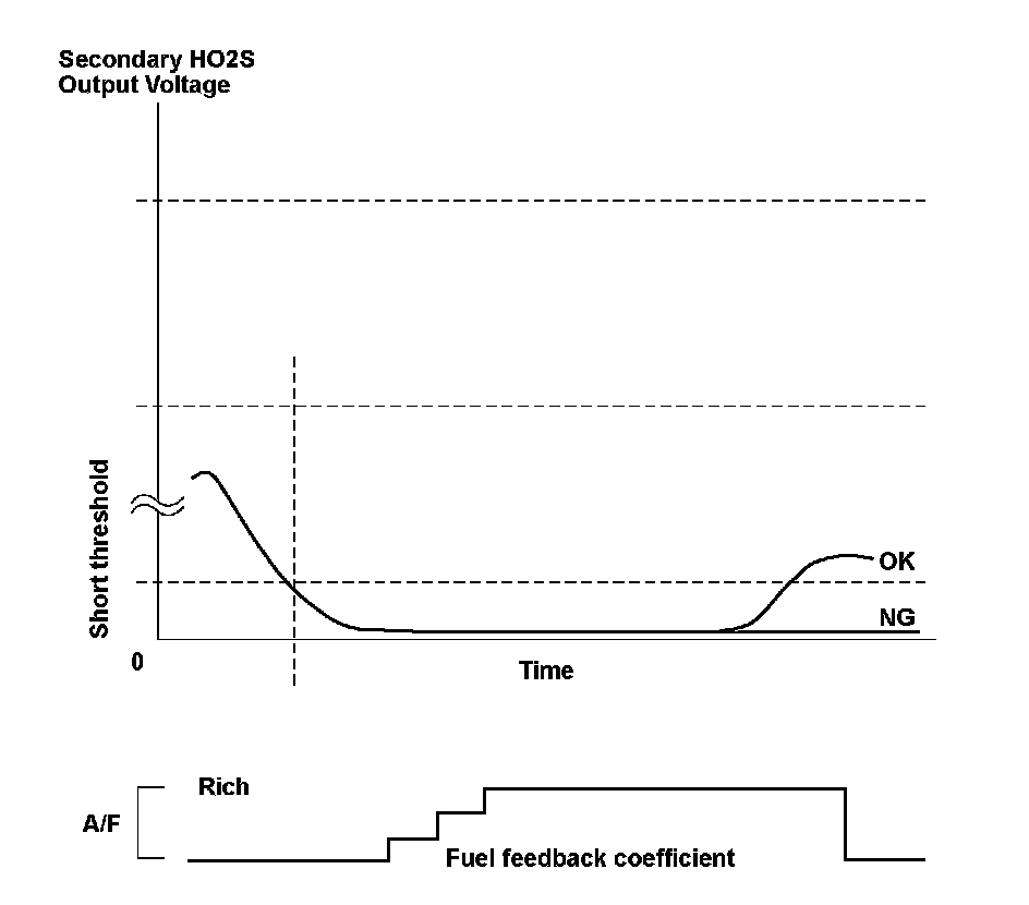 The rear secondary heated oxygen sensor (HO2S) (bank 1, sensor 2) detects the oxygen content in the exhaust gas downstream of the three way catalytic converter (TWC) during stoichiometric air/fuel ratio feedback control. The rear secondary HO2S controls the air/fuel ratio from the rear A/F sensor output voltage so that the TWC efficiency is optimized. After current is applied to the rear secondary HO2S heater, if the rear secondary HO2S output continues to be low (lean) during feedback control, a malfunction is detected and a DTC is stored.