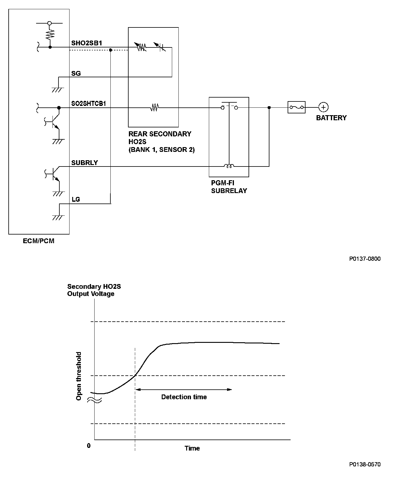 The rear secondary heated oxygen sensor (HO2S) (bank 1, sensor 2) detects the oxygen content in the exhaust gas downstream of the three way catalytic converter (TWC) during stoichiometric air/fuel ratio feedback control. The rear secondary HO2S controls the air/fuel ratio from the rear A/F sensor output voltage to optimize TWC efficiency. After current is applied to the rear secondary HO2S heater, if the rear secondary HO2S output continues to exceed the upper limit used during feedback control, a malfunction is detected and a DTC is stored.