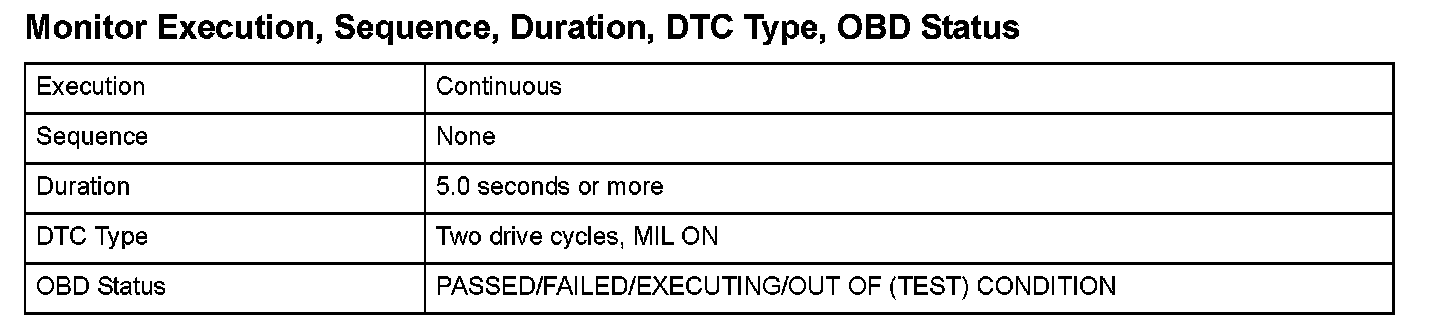 Monitor Execution, Sequence, Duration, DTC Type, OBD Status