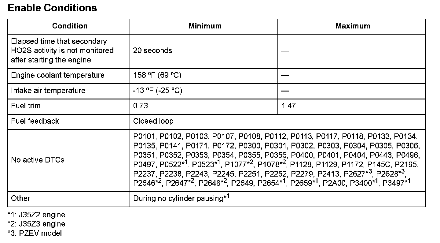 The rear secondary HO2S output voltage is 1.270 V or more for at least 5.0 seconds.