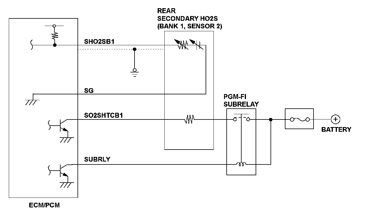 A heater for the zirconia element is embedded in the rear secondary heated oxygen sensor (secondary HO2S (bank 1, sensor 1)), and it is controlled by the engine control module (ECM)/powertrain control module (PCM). When activated, it heats the sensor to stabilize and speed up the detection of oxygen content when the exhaust gas temperature is cold. If the rear secondary HO2S heater draws other than a specified amperage, the ECM/PCM detects a malfunction and a DTC is stored.