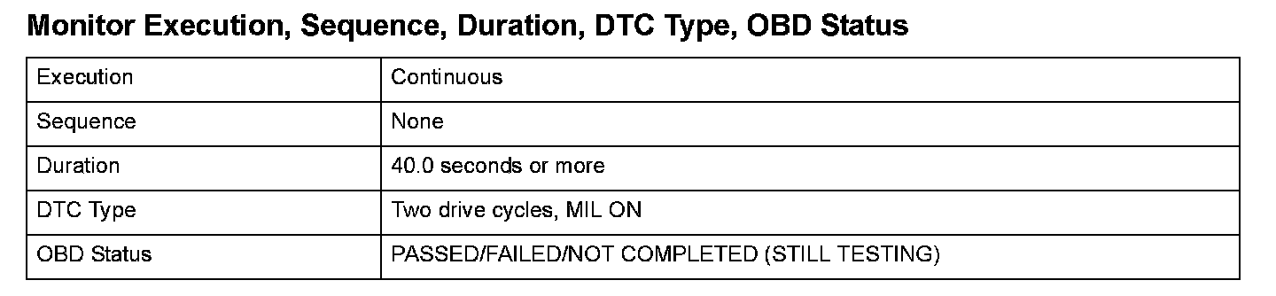 Monitor Execution, Sequence, Duration, DTC Type, OBD Status