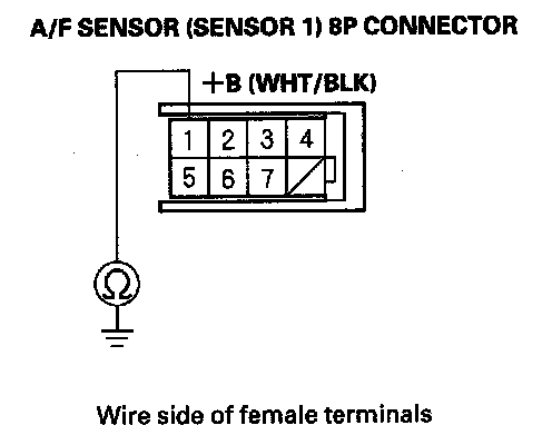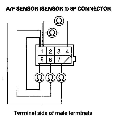 12. At the sensor side, check for continuity between A/F sensor (Sensor 1) 8P connector terminal No. 1 and each of the other terminals in the connectors individually.