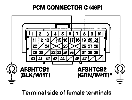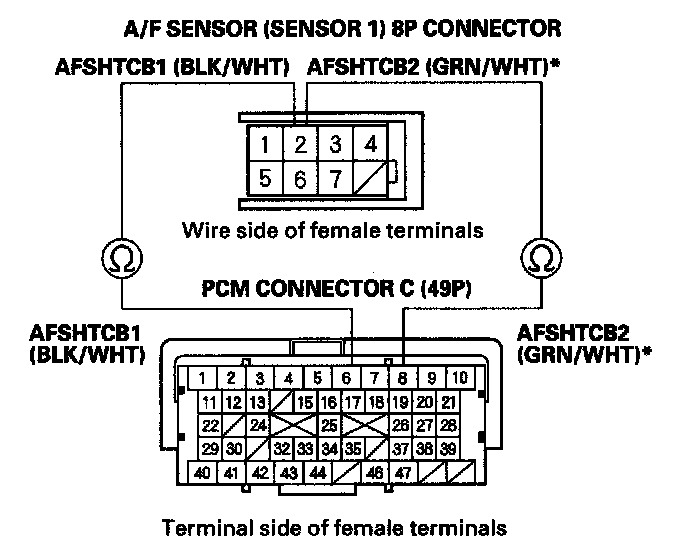 16. Check for continuity between A/F sensor (Sensor 1) 8P connector terminal No. 2 and PCM connector C6 (C8).