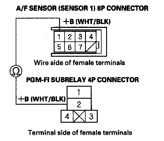 17. Check for continuity between A/F sensor (Sensor 1) 8P connector terminal No. 1 and PGM-FI subrelay 4P connector terminal No. 2.