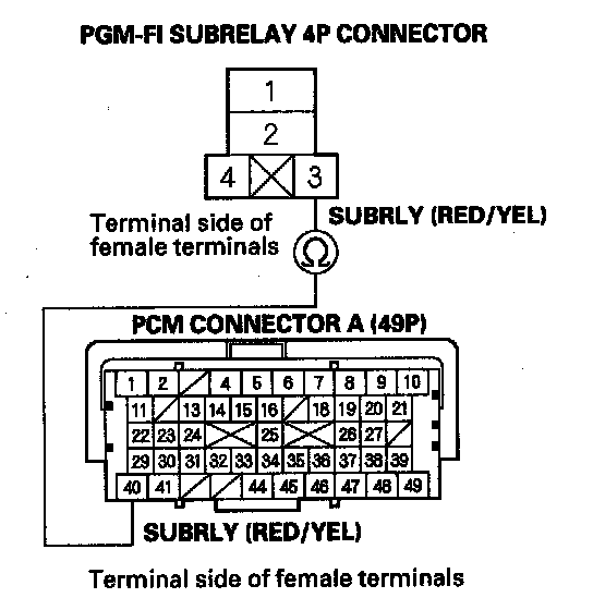 19. Check for continuity between PGM-FI subrelay 4P connector terminal No. 3 and PCM connector terminal A40.