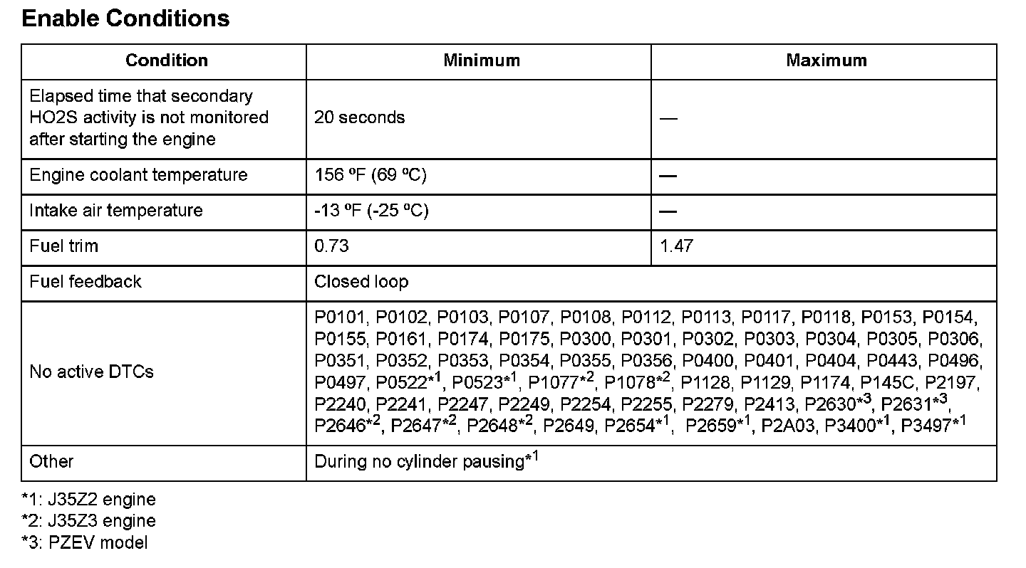 The front secondary heated oxygen sensor (HO2S) (bank 2, sensor 2) detects the oxygen content in the exhaust gas downstream of the three way catalytic converter (TWC) during stoichiometric air/fuel ratio feedback control. The front secondary HO2S controls the air/fuel ratio from the front A/F sensor output voltage to optimize TWC efficiency. After current is applied to the front secondary HO2S heater, if the front secondary HO2S sensor output continues to exceed the upper limit used during feedback control, a malfunction is detected and a DTC is stored.
