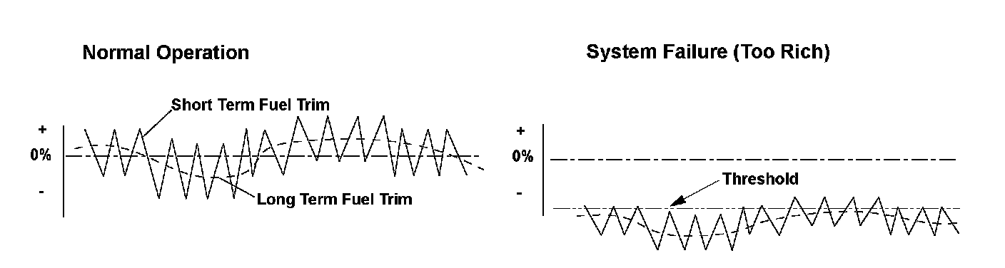 The engine control module (ECM) detects the oxygen content in the exhaust gas from the front air/fuel ratio (A/F) sensor (bank 2, sensor 1) signal voltage, and it uses fuel feedback control to maintain the optimal air/fuel ratio. The air/fuel ratio coefficient for correcting the amount of injected fuel is the short term fuel trim. The ECM varies short term fuel trim continuously to keep the air/fuel ratio close to the stoichiometric ratio for all driving conditions. Long term fuel trim is computed from short term fuel trim and is used to regulate long term deviation from the stoichiometric air/fuel ratio, which occurs when fuel metering components deteriorate with age or system failures occur. In addition, long term fuel trim is stored in the ECM memory and is used to determine when fuel metering components malfunction. When long term fuel trim is higher than normal, which is about 1.0 (0 %), the amount of injected fuel must be increased, and when lower than normal, it must be decreased. If long term fuel trim is lower than normal (too rich), a malfunction in the fuel metering components is detected and a DTC is stored.