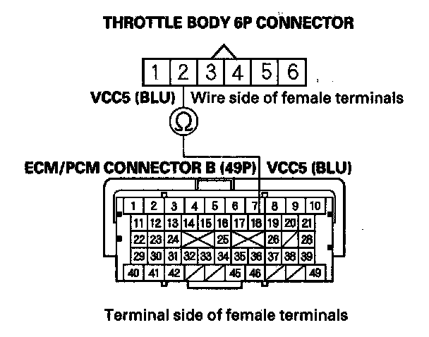 15. Check for continuity between ECM/PCM connector terminal B18 and throttle body 6P connector terminal No. 2.
