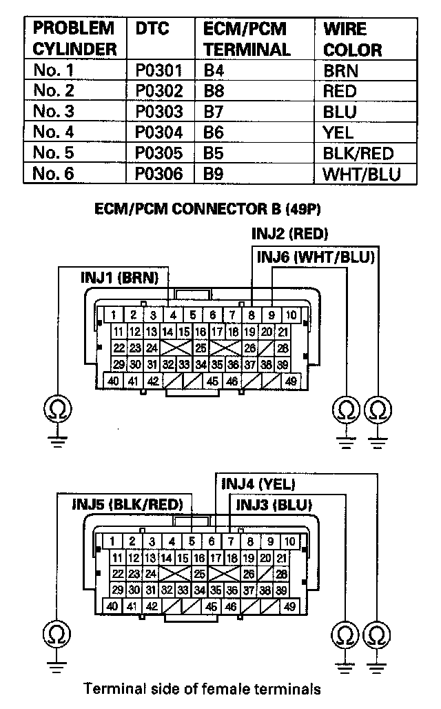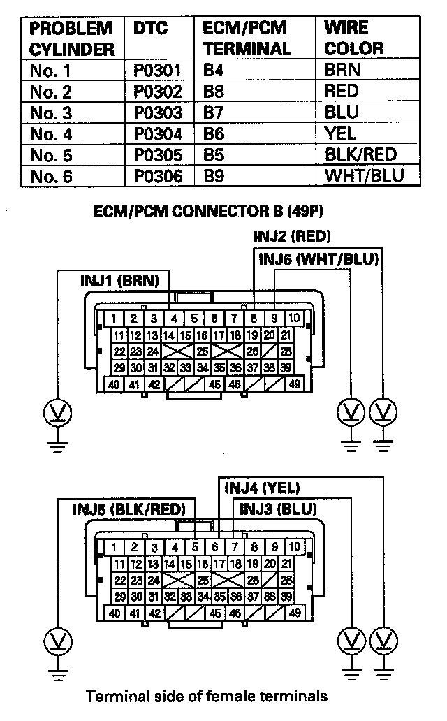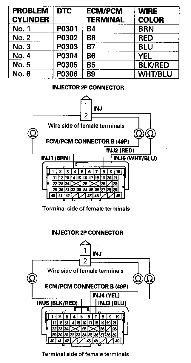 31. Check for continuity between appropriate injector 2P connector terminal No. 2 and the ECM/PCM connector terminal of the problem cylinder (see table).