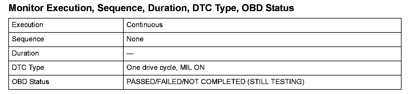Monitor Execution, Sequence, Duration, DTC Type, OBD Status