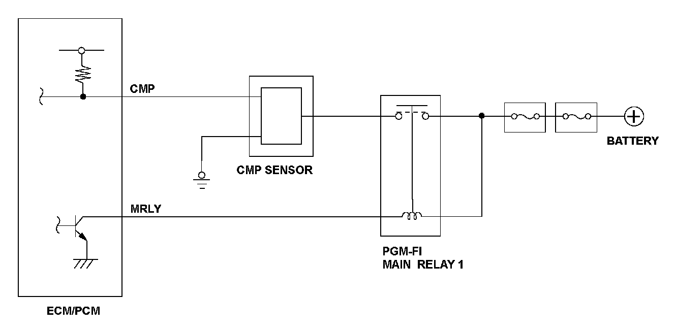 The camshaft position (CMP) sensor consists of a rotor and a semiconductor that detects rotor position. When the rotor turns after starting the engine, the changes of magnetic flux in the semiconductor are converted into pulsing signals to the engine control module (ECM)/powertrain control module (PCM). The CMP sensor detects the top dead center position of each cylinder for fuel injection timing. If no CMP sensor pulsing signals are detected, a malfunction is detected and a DTC is stored.