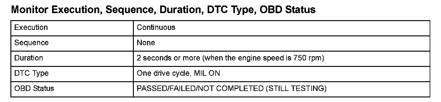 Monitor Execution, Sequence, Duration, DTC Type, OBD Status