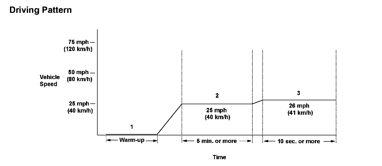 3. Then, drive immediately at a steady speed 26 mph (41 km/h) or more and engine speed between 1,500 - 3,000 rpm for at least 10 seconds.