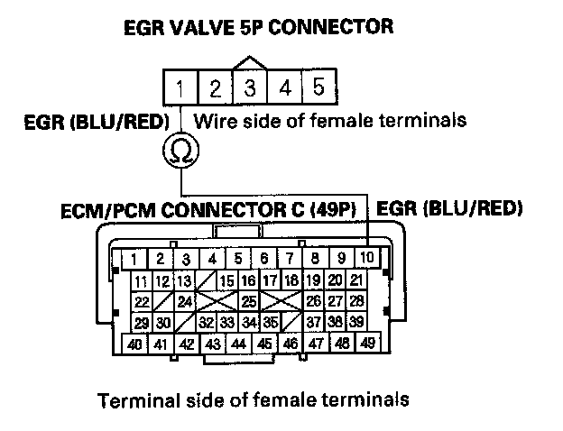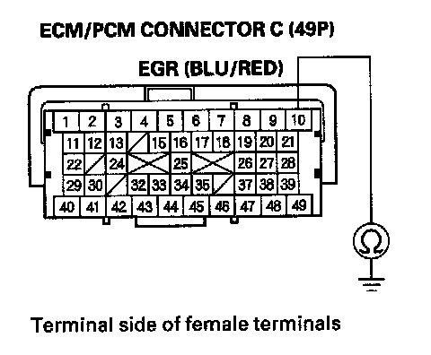 13. Check for continuity between ECM/PCM connector terminal C10 and EGR valve 5P connector terminal No. 1.