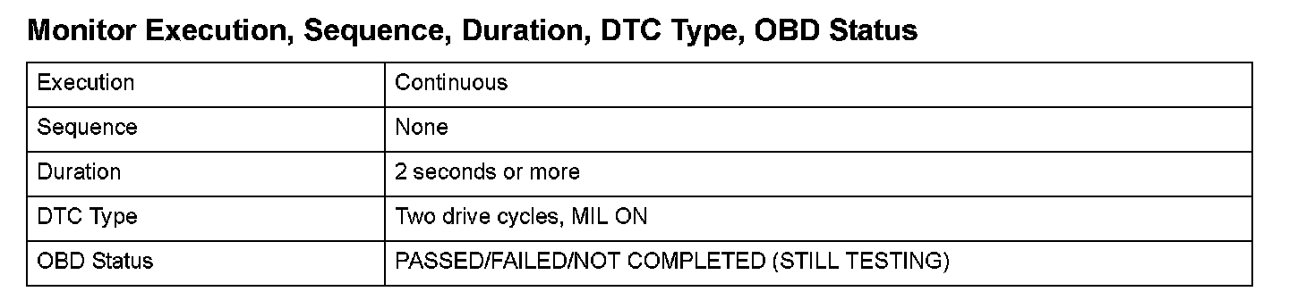 Monitor Execution, Sequence, Duration, DTC Type, OBD Status
