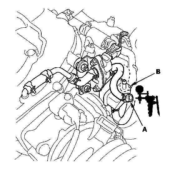 6. Disconnect the vacuum hose (A) from the purge joint (B) in the engine compartment, and connect a vacuum pump/gauge, 0 - 30 in.Hg, to the hose.