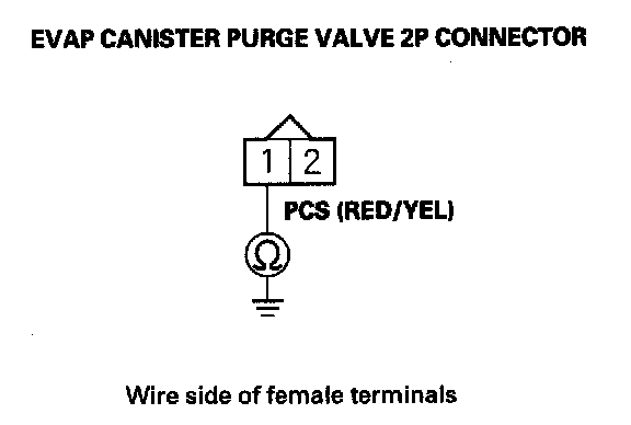 22. At the valve side, measure the resistance between EVAP canister purge valve 2P connector terminals No. 1 and No. 2.